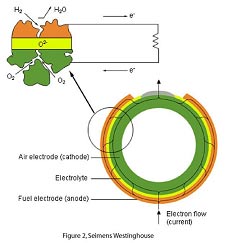 When oxygen and fuel are supplied to an SOFC, electricity is produced by movement of ions across an electrolyte. A tubular SOFC operates at a temperature of around 1000 degrees C (1800 degrees F) and requires an external heat source only during start up. During operation oxygen in the air is ionized at the cathode (Figure 2). Oxygen ions flow toward the cathode through the solid electrolyte, a crystal lattice typically made up of zirconium oxide and calcium oxide. Fuel is introduced outside the fuel electrode. Oxygen ions combine with the fuel at the anode and oxidize hydrogen to H2O and CO to CO2 releasing electrons. If the anode and cathode are connected in a circuit, current will flow. After startup it is self sustaining and will continue to operate long as fuel and air are supplied.